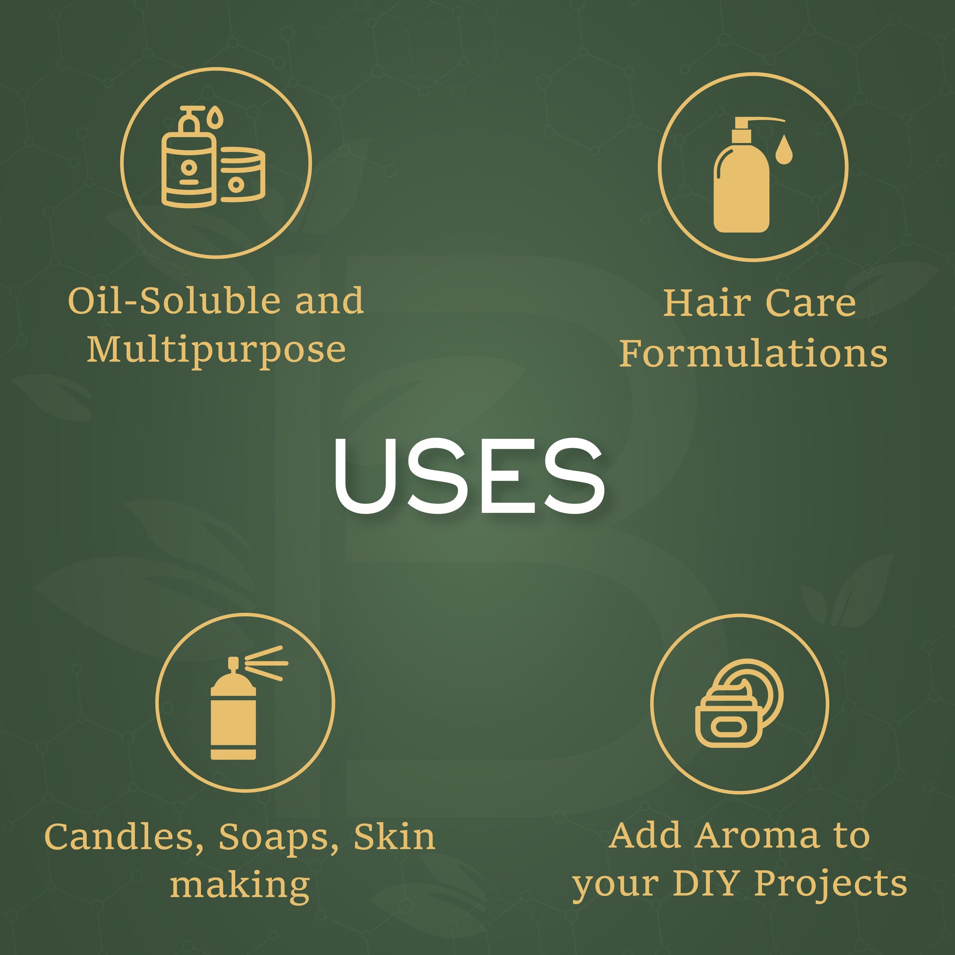 This oil is suitable for DIY projects like candles, soaps, air fresheners, skin and hair care products, cleaning products, aroma diffusers, potpourri, massage/body oil, etc.