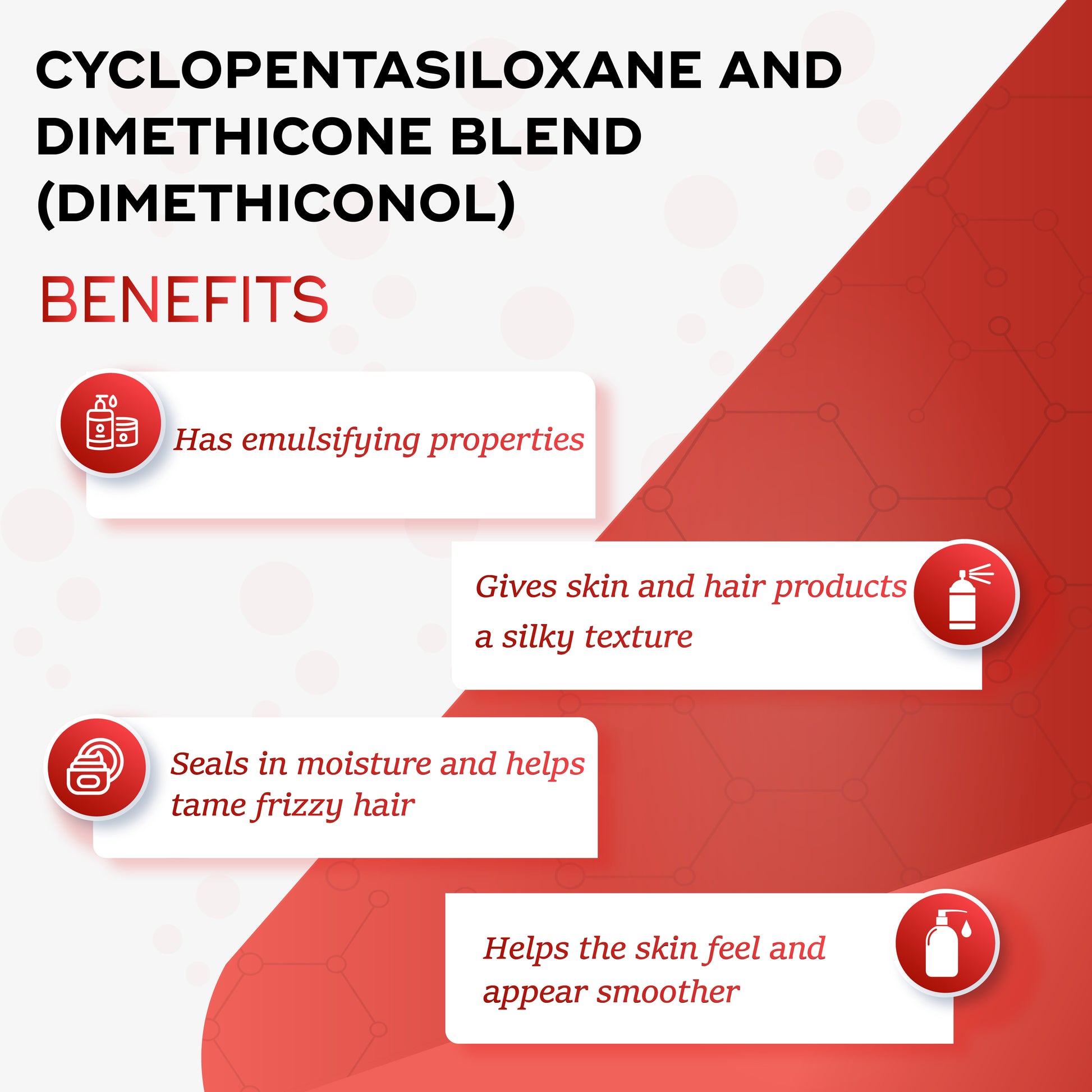 Dimethiconol is a very useful ingredient as it improves the texture of products while also acting as a moisturiser, increasing hydration, coating the surface of the skin and hair, and preventing evaporative water loss.